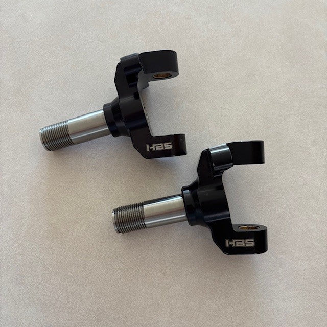 HBS Deluxe Spindle Set with Titanium Snouts. 10 Degree. 1.00 Diameter Titanium Snout. Fits 5/8" Kingpins. Black Anodized. Mounted Once, but Never Raced. Set of 2 Spindles.