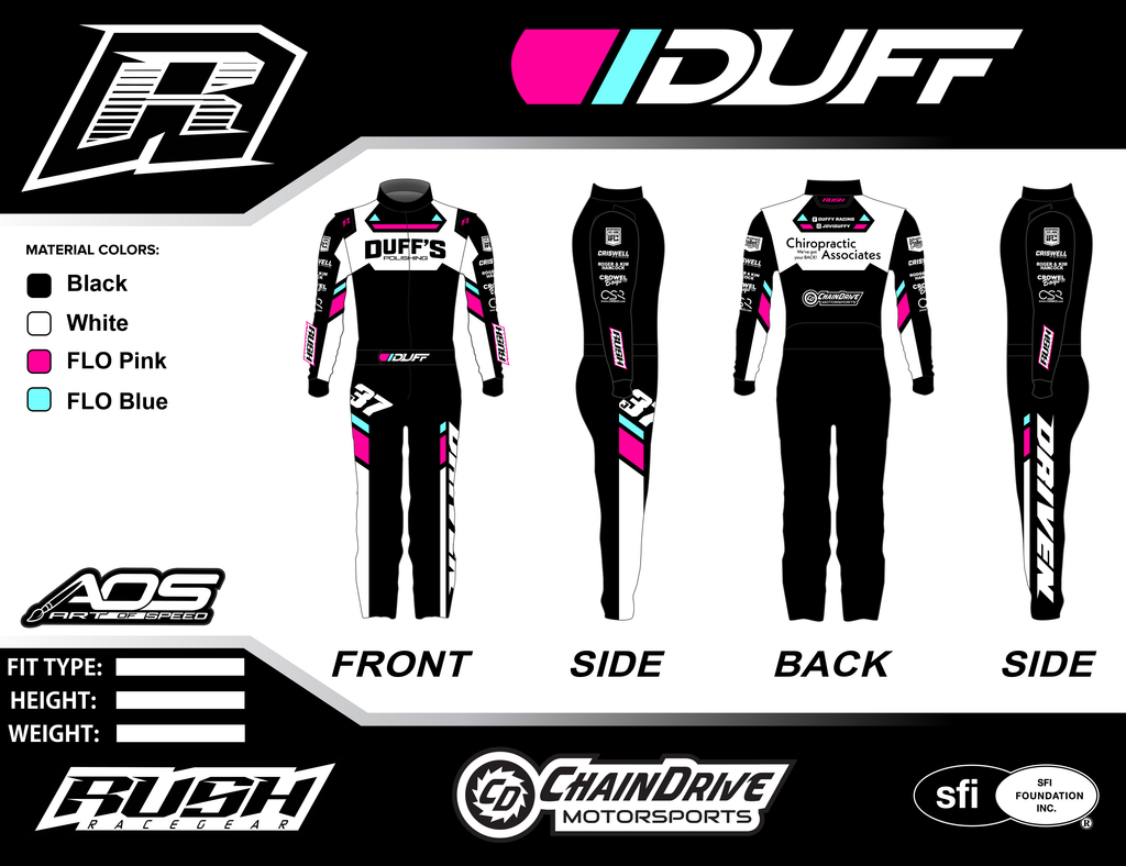 All Rush Race Gear Fire Suits are Custom Built to Order. A Non-Refundable $150 Deposit is Required to Start the Design Process. A 50% Deposit is Required to Start Production with the Balance Due Prior to Shipping. Free Ground Shipping for Orders Paid in Full in Advance. Please Allow 6-8 Weeks for Production.
