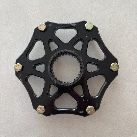 HBS Sprocket Carrier / Brake Hub for 1-3/4" Axles. 5.25" Bolt Pattern with 1/4-28 Threaded Studs. Black Anodized. Cosmetic Defects from Use. Good Used Condition.