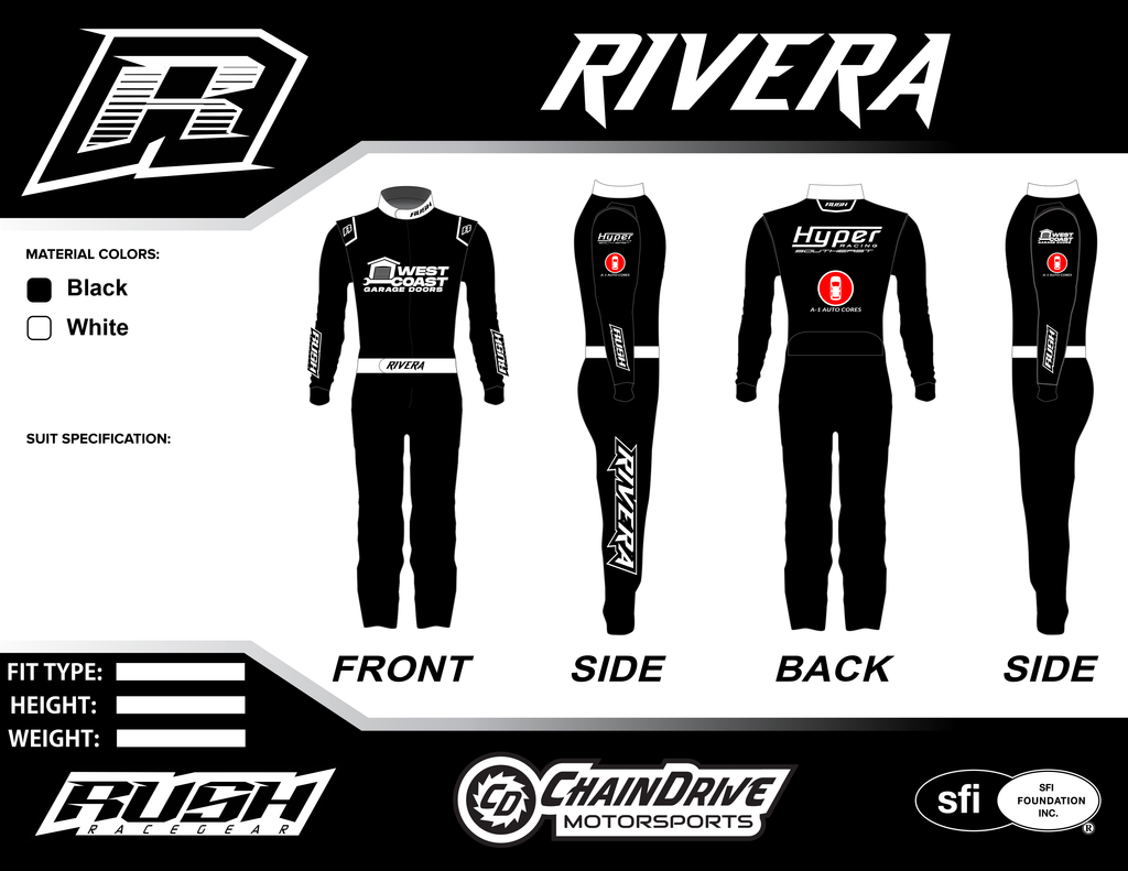 All Rush Race Gear Fire Suits are Custom Built to Order. A Non-Refundable $150 Deposit is Required to Start the Design Process. A 50% Deposit is Required to Start Production with the Balance Due Prior to Shipping. Free Ground Shipping for Orders Paid in Full in Advance. Please Allow 6-8 Weeks for Production.